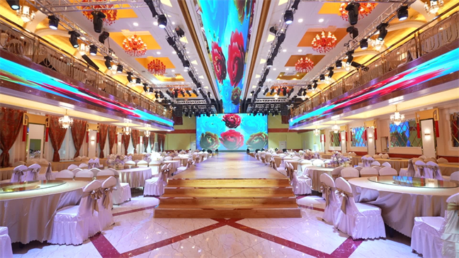 皇宮廳—金碧輝煌、皇宮式裝修,面積1038㎡,層高8.6米,配備愛(ài)情階梯、軌道威亞、二層觀(guān)禮臺(tái)、浪漫燈光秀、旋轉(zhuǎn)升降舞臺(tái)、頭頂天幕連接開(kāi)合大屏。可承接50桌的大型宴會(huì),也可舉辦600人的大型會(huì)議;還可用作會(huì)展、車(chē)展場(chǎng)地,每逢節(jié)假日還為市民上演文藝節(jié)目。